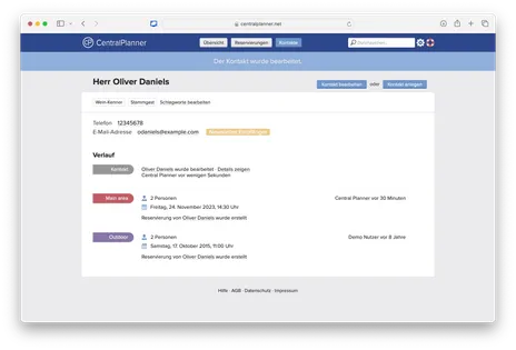 Das Wichtigste im Geschäftsleben sind gute Kontakte! CentralPlanner speichert automatisch bei jeder eingetragenen Reservierung die Kontaktdaten Ihrer Gäste. Name, Anschrift, Telefon und E-Mailadresse einfach bei der Reservierung notieren und bequem von jedem Ort abrufen. Innerhalb kürzester Zeit sammeln Sie so mehrere Tausend Gästedaten in Ihrem Reservierungssystem. Verbessern Sie Ihren Service durch die direkte Ansprache und das individuelle Eingehen auf die Wünsche Ihrer Gäste. Mit jedem Besuch lernen Sie Ihre Gäste besser kennen und können dadurch Ihr Angebot verbessern. Sie wissen wann und wie oft ein Gast bei Ihnen zu Besuch war. Informieren Sie Ihre Gäste auch dann, wenn diese gerade nicht bei Ihnen im Restaurant sind – wo Sie jetzt die Kontaktdaten haben können Sie Angebot und Menüs einfach per E-Mail versenden.