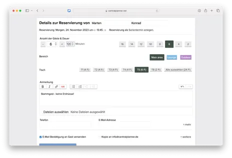CentralPlanner ersetzt in der Gastronomie nicht nur das klassische Reservierungsbuch aus Papier, es bietet noch viel weitreichendere Möglichkeiten. Übersichtlich gestaltet können Sie alle notwendigen Informationen zur Reservierung hinterlegen, neben den Kontaktdaten etwa den Raum oder den Tisch. Zusätzlich können aber auch andere Informationen eingetragen werden, die für Ihr Personal und Ihre Gäste den Ablauf reibungsloser gestalten. Muss ein Kinderstuhl zur Verfügung stehen? Ist Ihr Gast Vegetarier? Informationen, die in der Gastronomie das Wohlbefinden des Gastes steigern, auf Papier aber nur einmal verwendet werden und dann verloren gehen. Nicht so bei einer digitalen Gastronomie Software. Das Wissen bleibt Ihrem Restaurant und Ihrem Personal dauerhaft online verfügbar.