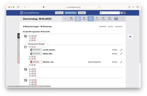 Sie suchen nach einem einfachen Buchungssystem für Ihre Schwarzlicht- oder Minigolfanlage? Sie möchten Ihren Gästen die Möglichkeit zur Online-Reservierung bieten, sodass Ihre Bahnen jederzeit und ohne manuelle Bestätigung gebucht werden können? Dann ist unser Online-Buchungssystem CentralPlanner das Richtige für Sie!